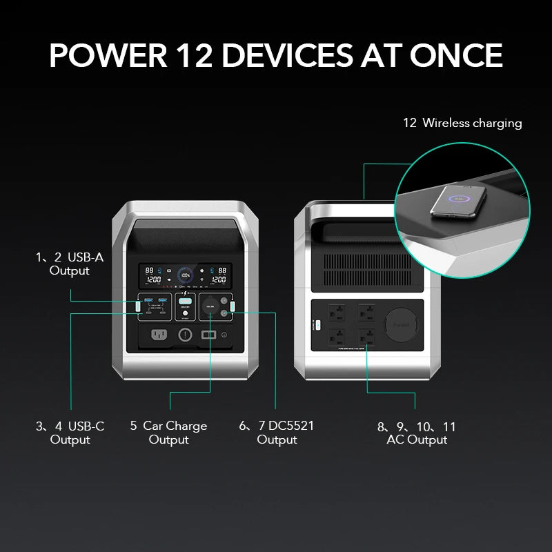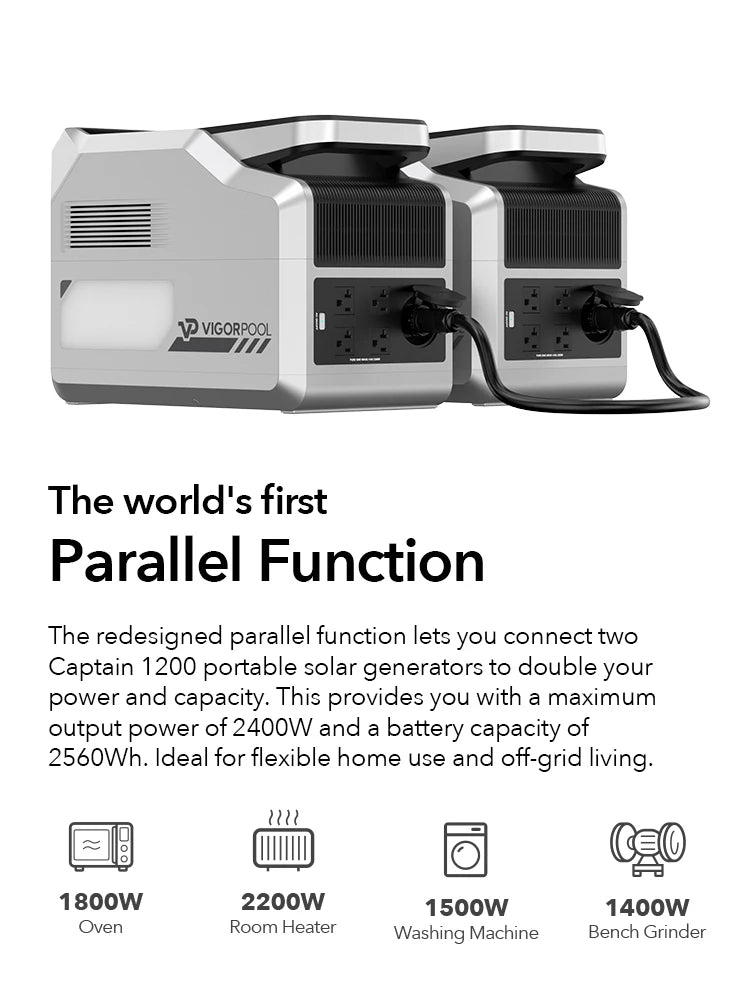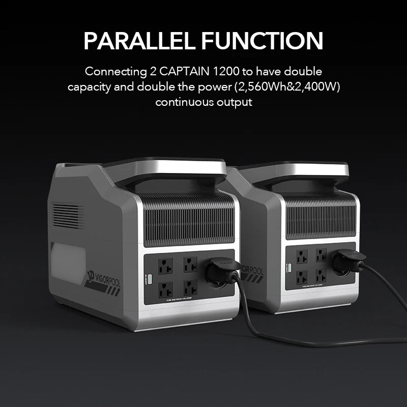 【Innovative Parallel Function】: Double Your Power Unlock unlimited potential with the industry-first parallel feature. Simply link two Captain 1200 Portable Solar Generators to double your output to 2400W and battery capacity to 2560Wh, ideal for flexible home applications and off-grid adventures.