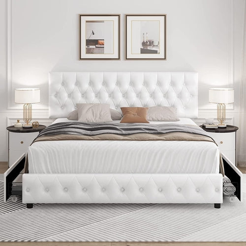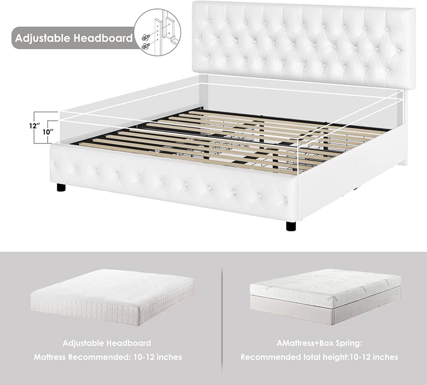 Adjustable HeadboardsThe soft, padded headboard is comfortable to lean against while reading or watching TV in bed. | Storage Drawers4 drawers provide plenty of room to neatly conceal everything from bed linens to clothing. The storage drawers are easy to roll out and in thanks to the castors on the base. | Sturdy StructureThis bed frame is composed of high-quality metal structure support and wooden slats, sturdy and durable. |