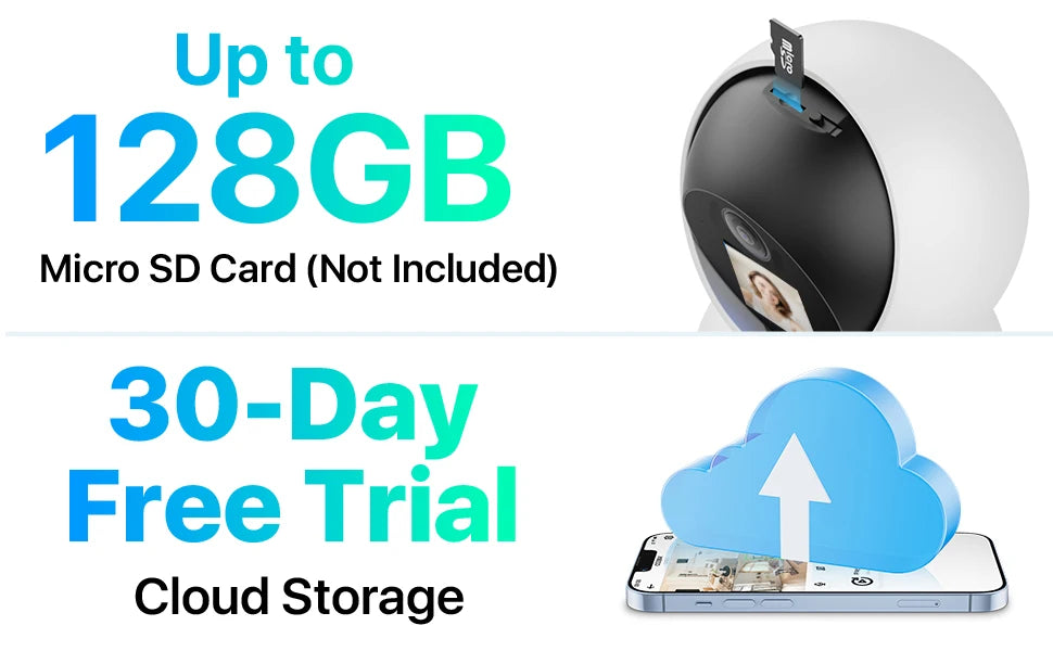 Save videos locally on a 128GB micro SD card or securely backup to the Cloud for added protection and accessibility.