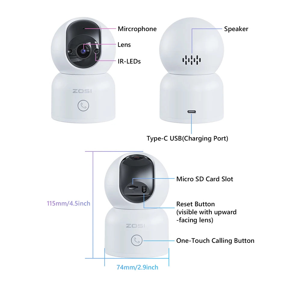 Storage: Micro SD card (max 128GB), encrypted Cloud backup, or connect to ZOSI PoE NVR for extended recording.
